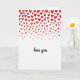 This greeting card shows a shower of red hearts falling from the top, with hearts in different sizes and slightly uneven shapes. The hearts are packed closer together near the top edge and spread out as they drift downward onto a wide white background. The bottom half stays mostly white, which keeps the focus on the hearts and the message. Near the lower center, the card says “love you” in smooth black cursive-style writing. The letters look like they were written by hand, giving the words a close, caring feel. The strong red against the white background makes the design feel romantic and direct 💘❤️.
