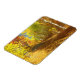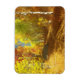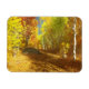 An overgrown path meandering through the birch forest on a sunny autumn day. The black and white trunks of the trees contrast with leaves and grass in all shades of gold, from pale yellow to deep orange, lit by the sun rays streaming through the branches.