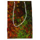 Looking up through the branches of a towering tree in autumn. The falling leaves of burgundy, red, gold, orange, yellow, and blue sparkle against the deep blue sky.