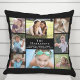 A custom black photo pillow to celebrate your family featuring an 8 photo collage, your last name in elegant white serif typography and everyone's first names in simple modern white lettering.