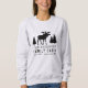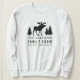 Women's sweatshirt with your personalized family name and cabin, cottage or other desired text along with an established date and location. This custom design features rustic style typography with artwork of a moose and pine trees silhouette in black. To see more designs like this, feel free to visit my store here at "Zazzle.com/Rustic_Charm". Thanks.