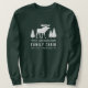 Men's sweatshirt with your personalized family name and cabin, cottage or other desired text along with an established date and location. This custom design features rustic style typography with artwork of a moose and pine trees silhouette in white. To see more designs like this, feel free to visit my store here at "Zazzle.com/Rustic_Charm". Thanks.