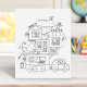 Somewhat haphazardly enhanced 3-story high family trailer is towed by a small car. There is a small vegetable garden on the roof, complete with a scarecrow. An open bathtub on the second floor. A garbage can at the back of the trailer. Some laundry is drying on the wind. Various family pets include a dog, a cat, a chicken, and even some goldfish. A small boy is waving from the trailer window. Made for easy coloring.