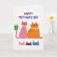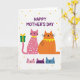 This card features a bright white background with the words “HAPPY MOTHER’S DAY” placed near the top in purple lettering, setting a cheerful tone ❤️. Golden yellow dots are scattered around like confetti, adding a light, celebratory sparkle. Below the text, two stylized cats sit close together, their gentle smiles and slightly turned bodies suggesting a cozy, affectionate bond. The left cat is pink with small white polka dots and a yellow ruffled collar, and it balances a green gift box with a yellow ribbon on its curved tail. Beside it, an orange cat with darker stripes wears a matching yellow collar, and their simple dot eyes and thin whiskers give them an easy, friendly expression. Along the bottom edge, three smaller cat faces peek up in pink, purple, and blue, like a little family group gathered in on the moment 🌼. The gift box is a rich green with a neat yellow bow, and the yellow dots float around the upper half of the design.