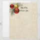 Wonderful Holiday Writing Paper with Christmas Season Gold and Red Ornaments and Pine Branches, with a background of an image of actual old handmade paper, is on this Family Christmas Letter Letterhead Paper. Images are public domain due to expired copyright.