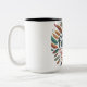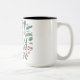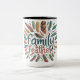 The tea mug design features the text "Family Feathers," in a colorful, script font. Intricate feather patterns decorate the letters, adding a touch of whimsy to the design.