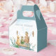 Introducing our exquisite favor box collection, designed to add a touch of charm and delight to your special occasions. Step into a picturesque scene where a wooden pier becomes the backdrop for a heartwarming moment. Imagine a young boy, his father, and their loyal canine companion seated upon the pier, engrossed in the art of fishing. Both father and son hold fishing rods adorned with freshly caught fish, a testament to their shared passion and the rewards of their patience. Every detail is lovingly captured in the delicate strokes of an elegant watercolor painting.