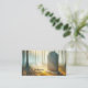 A serene forest illuminated by ethereal sunlight reveals a solitary gravestone surrounded by tall birch trees and a carpet of fallen leaves