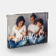 A beautiful horizontal acrylic photo block featuring "Family" in flowing white calligraphy script with a heart flourish, layered over a single custom photo. The elegant script overlay transforms a favorite family photo into a stylish keepsake. The photo is fully customizable. Printed on 1-inch thick Grade A acrylic, this photo block stands freely on any surface — a gorgeous gift for a loved one or a treasured addition to your own home decor.
