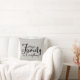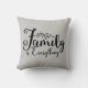 Pillow with quote in black cursive writing "Family is Everything" on grayish tan textured background. Design by Farmhouse Living. Size and fabric options are available and additional home decor products with this design.