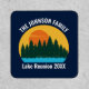 Beautiful family reunion lake vacation blue patch featuring the pretty blue waters under the forest of trees and cool orange sunset. Cute camping trip keepsake souvenir for your nature outing or wilderness group.