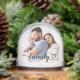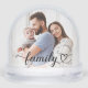 Modern and stylish custom Christmas snow globe features a favorite photo with a minimal black "family" typography overlay design that includes elegant flourish and heart details. The black script text color can be modified.