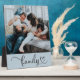This custom plaque features your favorite photo on a light blue-gray background with a modern 'family' text including flourish and heart detail. Custom photo, background color and text color can each be changed to suit your style to make this tabletop easel back photo plaque uniquely yours.
