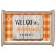 Retro vintage rustic farmhouse style personalized serving tree with rusty burnt orange yellow terracotta gingham plaid checkered pattern, and a natural weathered old wood plaque. ++++++++++ Personalize it with your personal or family monogram, name and your text! +++++++++ It can be a pretty keepsake custom gift for a bride, friend, or a family for a wedding, bridal shower, anniversary, country house housewarming, birthday, Christmas.
