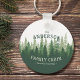 A stylish, rustic themed round keychain with your personalized family name and cabin, lodge or other desired text and it's location. This custom design features artwork of a pine tree forest silhouette in shades of forest and hunter green. Feel free to visit my designer store to see more items and designs like this. Thanks.