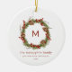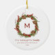 An elegant christmas greenery family initial ornament. This christmas tree ornament. features a greenery wreath with pine cones and berries and an initial in the middle of the wreath. All text on the card can be customized to create the perfect family christmas tree keepsake ornament.