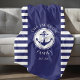 Fleece blanket featuring a nautical anchor themed navy blue and white striped pattern and personalized family name in the center. Personalize it with your own family name and year you established yor family. The perfect home decor for a lakehouse, beach hut or to bring some lake and beach feeling to your residential home.