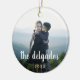 Simple and elegant holiday ornament features a photo on each side with your family name or custom caption overlaid in white calligraphy brush script lettering. Personalized with the year beneath.