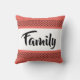 Throw pillow with coral background and fun black pattern at top and bottom. White is in the center with the word Family in a fun and pretty typography. Fun and stylish!