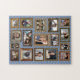 Celebrate your family or wedding memories with this unique, custom photo collage puzzle. The design is made to look like a wall gallery of photographs in fancy vintage frames. The gold and brass-colored frames surround your pictures on a "wallpaper" background of cornflower blue with a flower pattern. Add 17 personalized pictures through the easy templates. Your photos will automatically adjust to "fill" each frame. DESIGN TIP: To minimize cropping, upload horizontal pictures in horizontal frame shapes, etc. Choose your own puzzle size. For design help, contact PictureCollage.