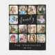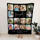 Create your own personalized keepsake blanket with white typography on a black background featuring "family" written in modern script (you can change this), fourteen rounded squares holding your favorite photos of family, pets, travels or other special memories and two lines of customizable text, such as your family name and the year established.