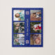 This puzzle is a unique gift to display six of your favorite photos. The text is editable. Here it has been set to create a christmas gift for grandpa, but just type in the box to personalize it as required. The photos are 'framed' in navy blue, and two stylized poinsettia flowers give added winter decoration. [Placeholder photographs © Storytree Studios, Stanford, CA]