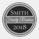 Round black and gray Family Reunion badge trimmed with white and black outlines. This family gathering keepsake gift can be personalized with your own family name, event information, and year.