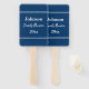 These family reunion hand fans are blue. They have white text. You can use it to show a custom message such as your family's last name and the year you're having the family reunion. (Shown: Johnson Family Reunion 20xx) The words family reunion are in a script.