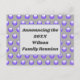 Announce your family reunion with these vibrant and inexpensive postcards. The pattern on the front features a vivid blue polka dot pattern against a dark gray background. The center features a blue-gray rectangle to provide the background for your announcement, family name, and year. The back of the postcard offers plenty of room for your event details.
