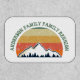 Cool custom family reunion patch for an autumn get-together with cousins, aunts, uncles, and grandparents. Order keepsake gifts for the whole crew with your last name and year in green surrounding the beautiful fall sunset image over the mountains and trees. Great personalized group camping trip souvenir for everyone.