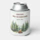 Can Cooler featuring pine wood forest and campfire. Everything is placed on a the white and light green background. Perfect for your next family reunion, birthday or any nature-themed event. Easily personalize all the text. - Kate Eden Art.