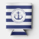 The front and back of this nautical can cover features an anchor in the center with a circular rope border. Personalize with your own family name and year of establishment, or replace with other text. Background is navy blue and white stripes.
