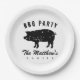 Family reunion party custom paper dinner plates. Disposable throw away party supplies for group gathering, engagement, wedding, dinner party, food event, garden BBQ, farm etc. Vintage pig design for meat lovers. Add your own surname or farm animal logo. Fun rustic summer design for bacon and pork lovers. Customizable background color. Available in small and big size.