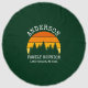 Rustic Pine Trees Summer Retro Sunset Family Reunion Round Beach Towel. Great for family reunion vacations from camping in the mountains to a vacation at the family cabin in the woods and a barbeque picnic by the lake. Forest Green Background. Personalize with your family name, location, year or date and more.