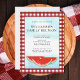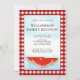 This unique invitation is decorated with watercolor watermelons and a blue sky on a red and white buffalo check background.