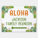 Welcome and/or direct family members to your tropical or Hawaiian Luau themed Family Reunion with this yard sign featuring watercolor tropical palm leaves and flowers, your custom text in your choice of font styles and colors and a directional arrow pointing the way and is printed on both sides. The sample shows ALOHA and NAME FAMILY REUNION. ASSISTANCE: For help with design modification or personalization, color change or if you would like coordinating items, contact the designer BEFORE ORDERING via the Zazzle Chat MESSAGE tab below or email makeitaboutyoustore@gmail.com.