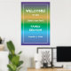 Family Reunion Welcome Sign on blue green blend colorful background. Fully customizable text to personalize for your family event. Poster can be hung on wall or door, or mounted to board or easel at the entry to your party.