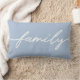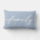 Celebrate family with this light blue pillow featuring "family" script typography in white.
