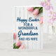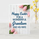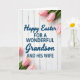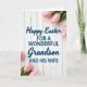 This design shows a flat-lay scene on a white painted wooden plank surface, where a layered greeting in deep blue sits right in the center. The message is arranged in two lettering styles, with flowing cursive-like words used for the celebratory parts and family titles, and a neat sans-serif style for the connecting lines. The text is stacked with the largest words in the middle, while smaller lines above and below guide the eye through a seasonal wish for a loved one and their partner. Around the edges, several pink flower buds with green stems and leaves are placed near the corners, gently framing the words like a quiet bouquet 🌷. The soft pink petals and the rich blue lettering create a tender contrast that hints at closeness and affection without needing extra decoration. Light falls evenly across the scene, bringing out faint wood grain, tiny paint imperfections, and the natural curves of each bud 🐇. In the corners, the buds angle inward toward the center, with a few leaves overlapping the plank seams.