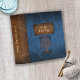 Blue, faux leather background. Brown, faux stitched leather spine that wraps to front and back. Tree with heart at top in brown on front, with a faux leather tag, and text "Our Family" in gold that can be customized. Also, spine wording can be customized.