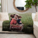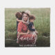 Create a custom fleece blanket to celebrate your family. "family" overlays your photo in a stylish white script with swashes. Add your name in simple white typography.