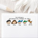 Customizable stick figure family address labels featuring a dad with thick dark hair, mom with brown hair, a boy with a blue baseball cap, boy with a green baseball cap, and a dog! You can customize this item with names and an address!