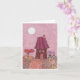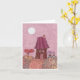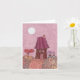 Beautiful and fanciful pink card that could be used either for an anniversary or for Valentine's Day. Features a tiny house, two gnomes holding hearts, a full moon, a pink sky, a flowery yard, and a heart-shaped plant. Card is blank inside.