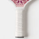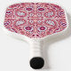This pickle ball paddle has an a fancy paisley pattern in shades of pink and white with flowers and lace bordered tear drop shapes.