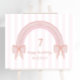 Coquette girly birthday theme featuring illustration of a pink rainbow with pink bows at the ends. Light pink stripe background.