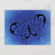 A cool illustration of a black butterfly with an elegant, ornate design and fancy accents. The background is a blue faded denim texture with distressed / grunge tones.