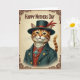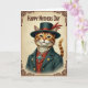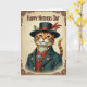 This card features a well-dressed, humanlike tabby cat posed like a vintage portrait, with golden eyes that meet yours in a gentle, attentive way ❤️. The cat wears a deep teal top hat with a crimson band and a few matching feathers, giving it a slightly flirty, friendly flair. A strand of white pearls rests at the neck, drawing your eye to an ornate silver pendant with curled detailing and a large teal gemstone. A dark teal coat with shiny gold buttons sits over a rust-red pleated shirt, creating a cozy, old-fashioned look that feels like a fond keepsake. The background is a warm parchment tone, softly aged and inviting, as if meant to be kept close on a mantel. An intricate filigree frame surrounds the scene, adding lacy detail around the edges like a treasured picture. Near the top, the words “HAPPY MOTHERS DAY” appear in uppercase lettering in a dark tone that stands out against the light background 🌼. The border is symmetrical and finely detailed, with curling lines that trace all four sides.