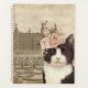 Vintage sepia tint background photo of a castle with manicured gardens and overlay of beautiful fancy black and white cat with floral crown