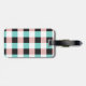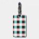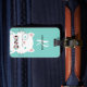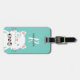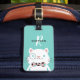 Turquoise luggage tag with a fancy white cat wearing a monocle and a polka dot bow-tie. Personalize with name and initial in black and white.