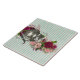 Fun and fancy digital collage features a pink and aqua striped background, pink and burgundy tint floral bouquet and vintage Alice in Wonderland Cheshire Cat illustration.